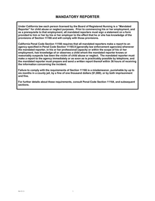 Mandatory reporters are required to report the facts and circumstances that led them to suspect that a child has been abused or neglected. We do not have to have evidence or definitive proof of any wrongdoing but if there are any concerns we have to report it. All persons hired into positions included on the list of mandated reporters are required upon employment to be provided with a statement informing them that they are a mandated reporter and their obligations to report suspected cases of abuse and neglect pursuant to California Penal Code Section 111665.